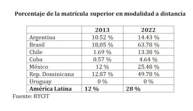 En la región de América Latina, en la educación superior, el porcentaje de estudiantes insertos en programas a distancia pasó del 12% en el año 2013, a 28% en el año 2022. La pandemia, más allá de imponer un momentáneo cambio radical que posteriormente regreso a los guarismos anteriores, no cambio sustancialmente una tendencia estructural al avance de la educación a distancia. Ello aconteció en todos los países siendo Uruguay la única gran excepción según el Observatorio de la Educación Superior
