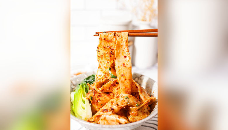 Los fideos Biang Biang son un famoso plato de fideos estirados a mano de Xi’an, China. Este plato lleva fideos anchos estirados a mano, cubiertos con una salsa a base de aceite de ajo y chile y vinagre negro chino. Es aromático, con un toque de ajo, picante, adormecedor, sabroso y ácido. ¡Todos los sabores increíbles en uno!