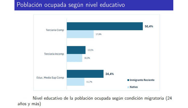 Un punto de análisis que destacan las investigaciones del MTSS y la Udelar es el nivel educativo. La población migrante reciente suele poseer niveles educativos formales superiores al promedio de la población nativa, con una alta proporción de profesionales y técnicos. No obstante, se observa una «sobrecalificación» en muchos puestos como por ejemplo trabajadores con títulos universitarios desempeñando tareas en sectores de servicios básicos o comercio. Además la jornada laboral semanal promedio de los migrantes es de 40,1 horas y la de los nativos de 37,2 horas.