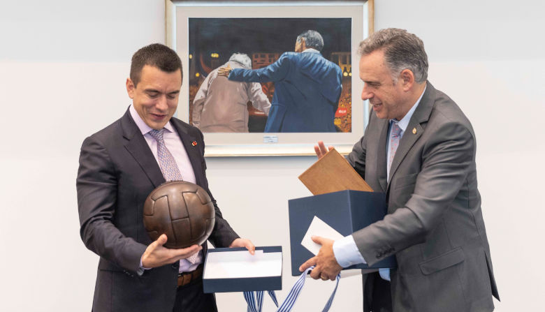 Orsi obsequió al presidente de Ecuador una réplica de cuero de la pelota con la que se disputó la final del campeonato mundial de 1930.