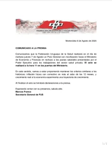 Este jueves, la Federación Uruguaya de la Salud (FUS) realizará un paro de actividades en todas las mutualistas del país, como medida de rechazo a las pautas salariales propuestas por el gobierno en el marco de la negociación colectiva.